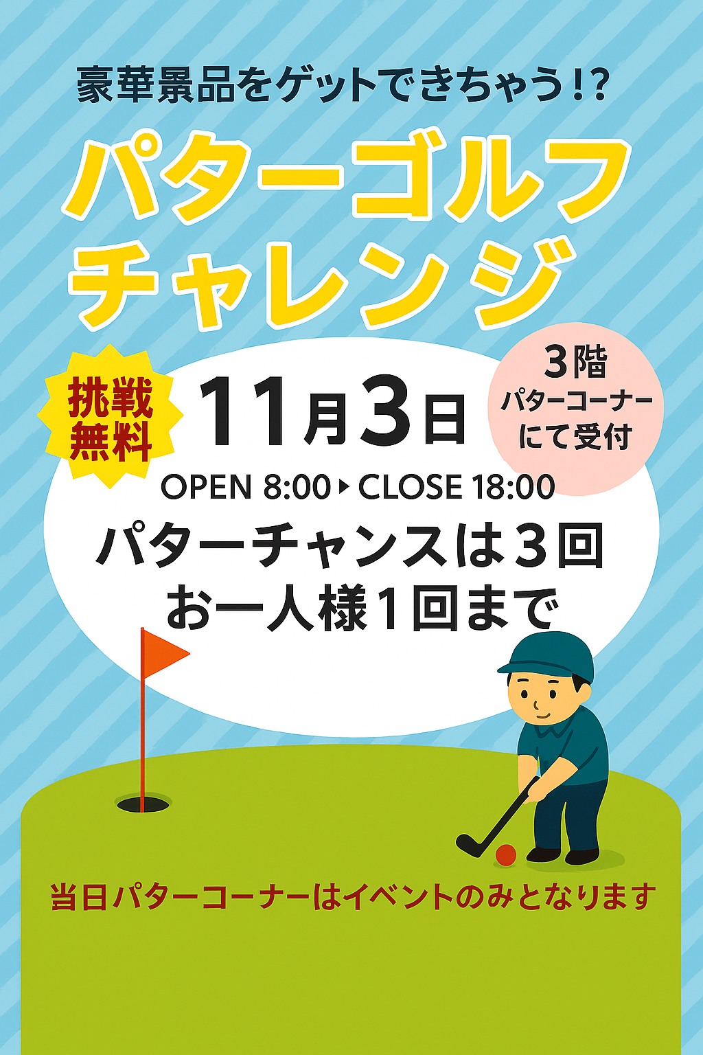 当日パターコーナーはイベントで使用する為、ご使用ができませんのでご了承下さい #江東区 #大島 #qrコード #ゴルフ #ゴルフ練習場 #パター #イベント